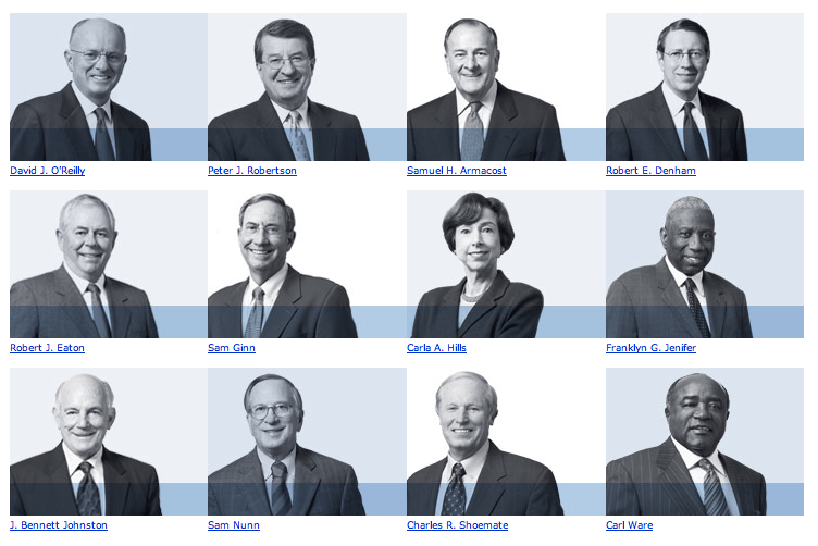 Kenneth Duberstein:Boeing Co.重役。The Travelers Companies, Inc.重役。Franklin & Marshall College、USF&G Corporation、American Stock Exchange LLC、「Fannie Mae」重役等多数。Brookings、CFR。